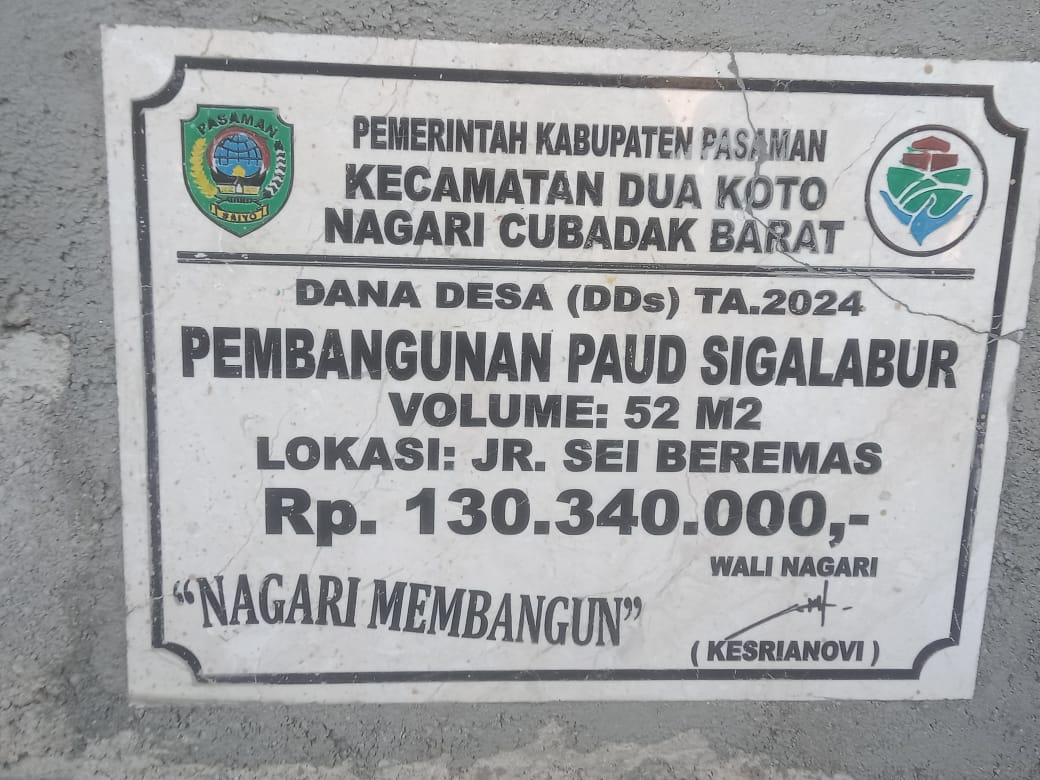 PASAMAN, Beritanegara.com – Pembangunan gedung Pendidikan Anak Usia Dini (PAUD) di Sigalabur, Jorong Sungai Beremas, Nagari Cubadak Barat, Kecamatan Dua Koto, Kabupaten Pasaman, yang menggunakan dana nagari tahun anggaran 2024, kini menuai polemik. Dua guru PAUD Harapan Maju, Yesna dan Nani Asmar, memilih mengundurkan diri dari PAUD Harapan Maju, setelah muncul persoalan terkait penerimaan bangunan baru tersebut.